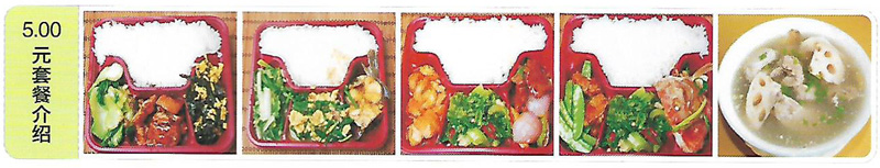 (例如:5元可吃二葷二素,米飯自由吃,任吃飽,送例湯)。
